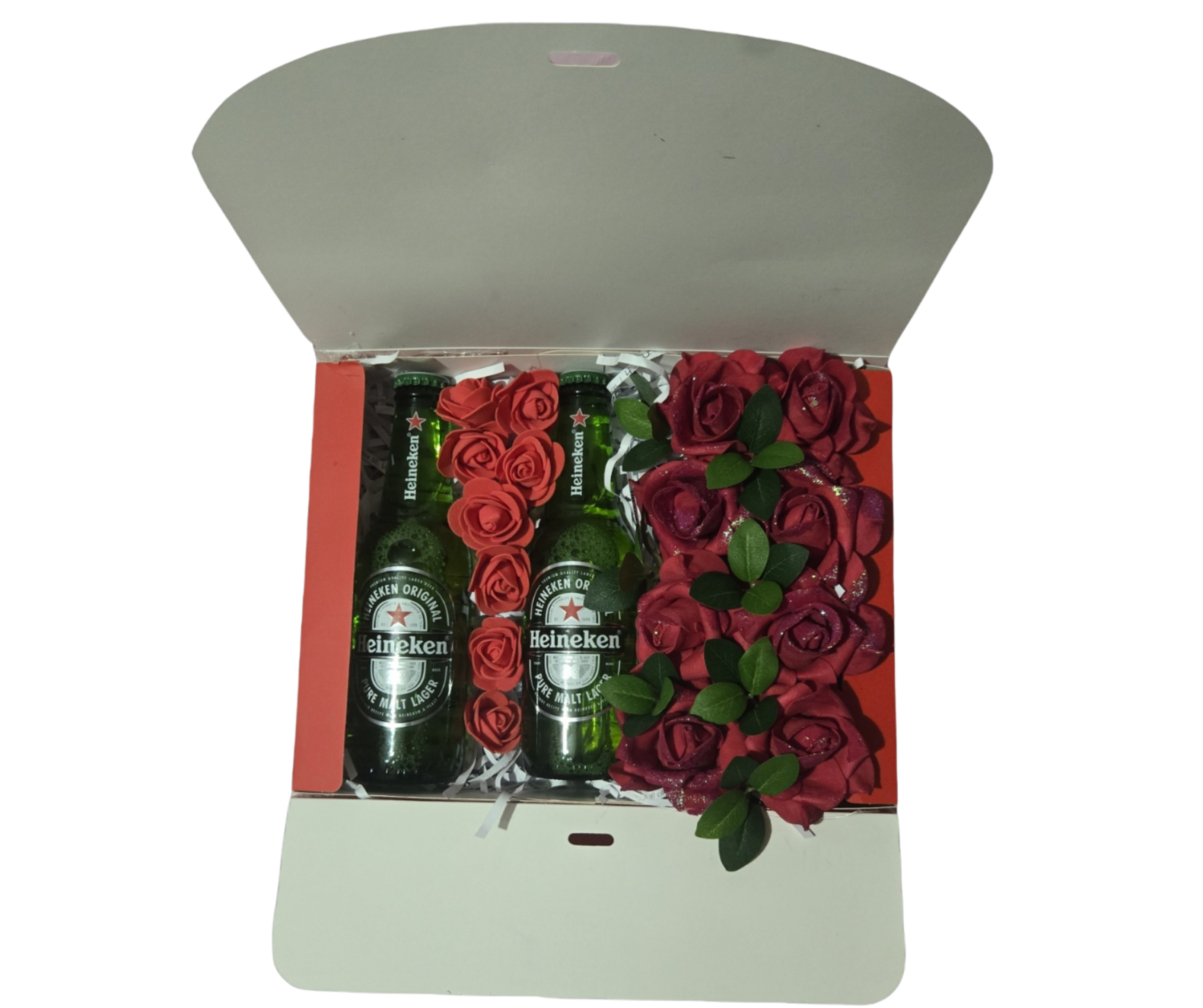 For the beer lover in your life, choose our “Heineken Artificial Flower Box.” This refreshing gift set features two bottles of premium Heineken lager, elegantly nestled among a bed of vibrant red artificial roses. It’s a fun and romantic twist on the classic bouquet.